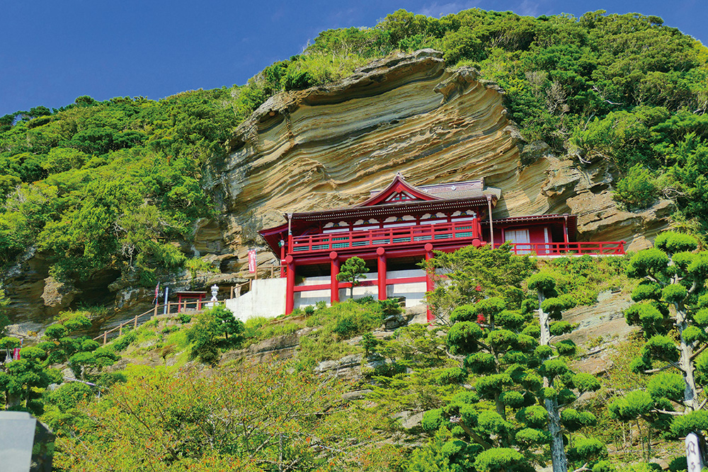 本尊は十一面観音菩薩の磨崖仏で、堂内から像を近くで拝めるほか、館山湾や伊豆大島などを一望でき、初日の出や夕景の名所としても多くの参拝者・観光客が訪れます。